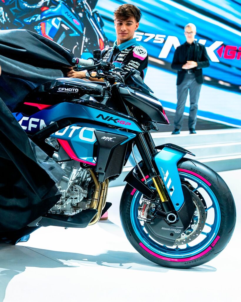 Por último, aunque no en ese orden en la presentación, CFMOTO junto al Aspar Team presentaron la edición GP de la 675NK, una versión con todos los chiches -suspensiones, pintura, escape, frenos, gomas, fibra de carbono, etc.- de la 675NK que se presentó el año pasado, llevando el rendimiento de la moto a otro nivel y, también, poniendo en valor la relación entre la marca y el equipo Aspar de competición y los logros que han tenido hasta ahora con los títulos obtenidos.