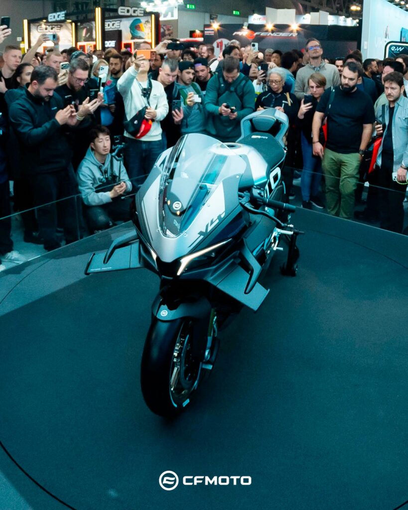 El año pasado cuando llegamos al stand de CFMOTO en EICMA, mientras mirábamos algunas de las novedades que se venían, como las 675 NK y SR, nos encontramos con un motor V4 de 997 cc que la marca se encontraba desarrollando y que prometía un desempeño más que interesante para una moto supersport. Hoy ese motor ya estaba puesto en una moto -prototipo, pero moto al fin- que anticipa lo que el fabricante chino tiene en mente y el nivel de desarrollo que puede lograr. El motor entrega 210 caballos de potencia en una moto que logra una relación peso-potencia de menos de 1 kilo por caballo, una locura total.