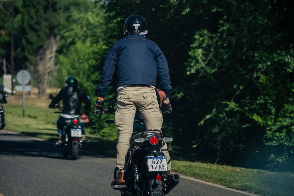 Max: Casco HJC V10; campera, pantalón y botitas Moore, guantes Brooklyn.