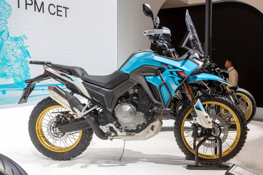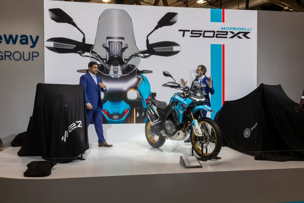 Por el lado de las adventure presentaron la T502XR, una moto que la marca define como 50/50 con llantas de rayos tubeless, rodado 18″-21″, 200 mm de recorrido de suspensiones con acelerador electrónico y cuatro modos de conducción. La moto se mostró en el tradicional celeste y blanco de Morbidelli con detalles en rojo, un color que vamos a ver mucho en los próximos años.