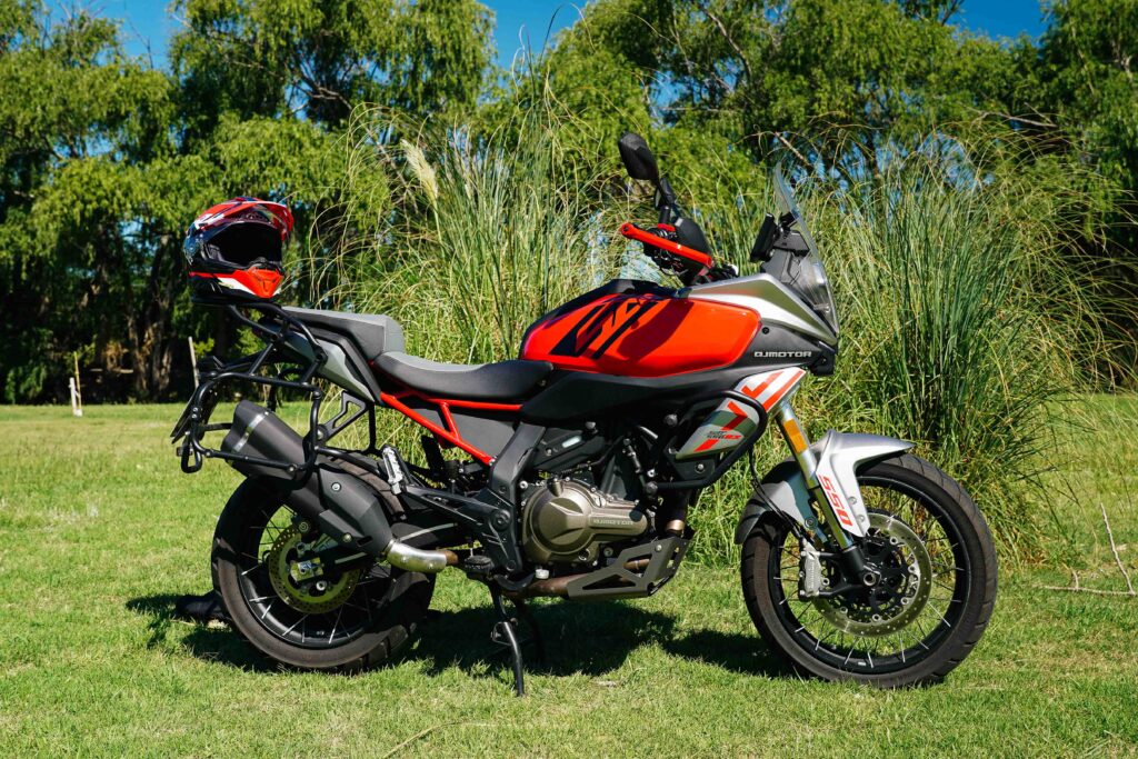 La posición de manejo es muy QJ. Es un sillón con ruedas, diseñado para cubrir kilómetros, con un manubrio lanzado hacia el piloto y comodidades como puños y asiento calefaccionados, cubrepuños y luces auxiliares de serie, que la convierten en una moto realmente lista para viajar. Además cuenta con caballete central y cubre cárter, algo que toda moto de aventura debería traer. La protección aerodinámica es muy buena del cuello para abajo, con una moto de porte grande, con superficies bien estudiadas pero deficiente a la hora de hablar del parabrisas, que es bajo. A su favor no genera turbulencias molestas, que muchas veces es mejor que una pantalla más alta pero que genere este tipo de fenómenos que terminan siendo muy cansadores en un viaje largo. Quien vaya de acompañante tiene un asiento mucho más alto y bastante cómodo, donde en muchos casos va a poder disfrutar de una vista ininterrumpida del paisaje gracias a la diferencia de altura entre ambos.