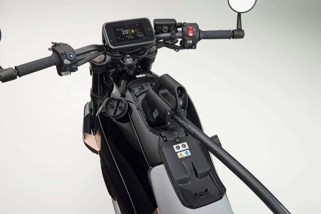 La barra de luces horizontal es la nueva seña de identidad de las motos eléctricas de Honda, con un carenado de base negro y detalles dorados. Las superficies al tacto son lisas y despejadas. El objetivo es transmitir una sensación de calma incluso antes de arrancar, y complementar con una conducción silenciosa y unos controles sencillos. Un selector de desaceleración en el manillar permite elegir el nivel de regeneración al soltar el acelerador, para poder planear o aumentar la sensación de frenado del motor al cambiar la carretera.
